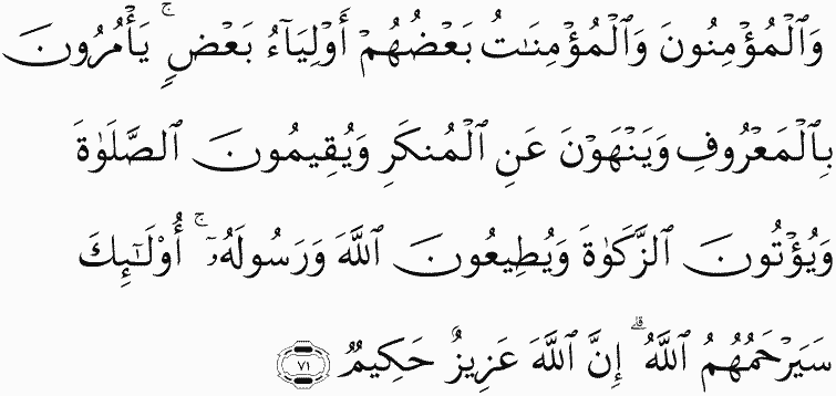 The believing men and believing women are allies of one another. They enjoin what is right and forbid what is wrong and establish prayer and give zakah and obey Allah and His Messenger. Those - Allah will have mercy upon them. Indeed, Allah is Exalted in Might and Wise.