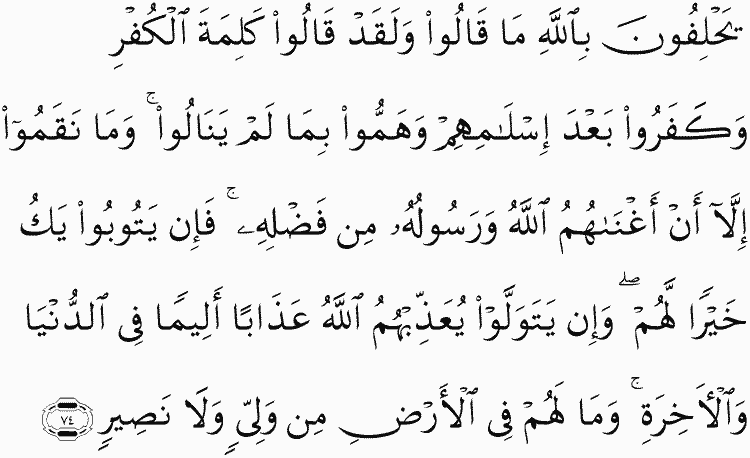 They swear by Allah that they did not say [anything against the Prophet] while they had said the word of disbelief and disbelieved after their [pretense of] Islam and planned that which they were not to attain. And they were not resentful except [for the fact] that Allah and His Messenger had enriched them of His bounty. So if they repent, it is better for them; but if they turn away, Allah will punish them with a painful punishment in this world and the Hereafter. And there will not be for them on earth any protector or helper.