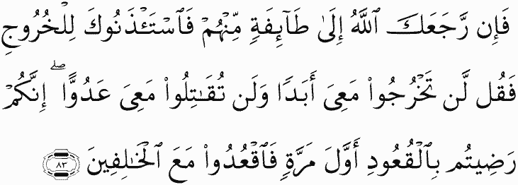 If Allah should return you to a faction of them [after the expedition] and then they ask your permission to go out [to battle], say, "You will not go out with me, ever, and you will never fight with me an enemy. Indeed, you were satisfied with sitting [at home] the first time, so sit [now] with those who stay behind."