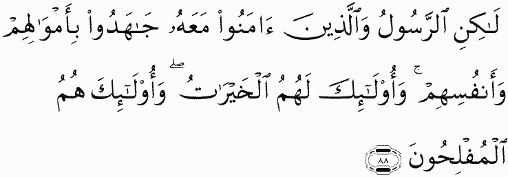 But the Messenger and those who believed with him fought with their wealth and their lives. Those will have [all that is] good, and it is those who are the successful.