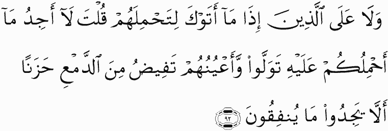 Nor [is there blame] upon those who, when they came to you that you might give them mounts, you said, "I can find nothing for you to ride upon." They turned back while their eyes overflowed with tears out of grief that they could not find something to spend [for the cause of Allah ].
