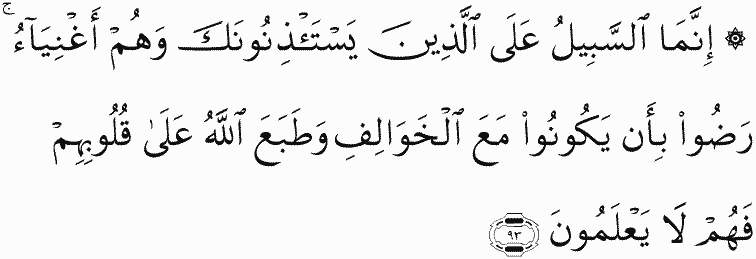 The cause [for blame] is only upon those who ask permission of you while they are rich. They are satisfied to be with those who stay behind, and Allah has sealed over their hearts, so they do not know.