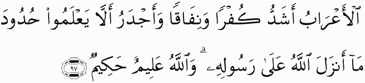 The bedouins are stronger in disbelief and hypocrisy and more likely not to know the limits of what [laws] Allah has revealed to His Messenger. And Allah is Knowing and Wise.