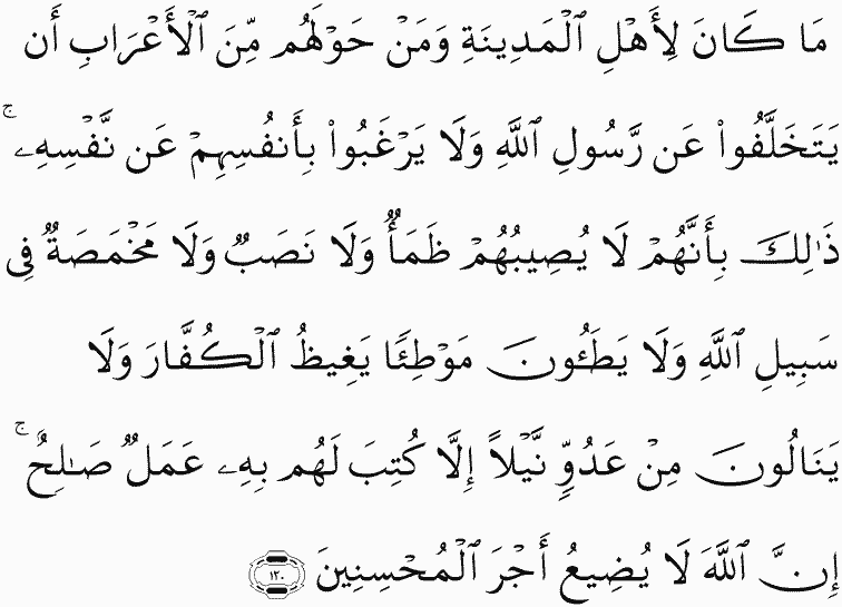 It was not [proper] for the people of Madinah and those surrounding them of the bedouins that they remain behind after [the departure of] the Messenger of Allah or that they prefer themselves over his self. That is because they are not afflicted by thirst or fatigue or hunger in the cause of Allah , nor do they tread on any ground that enrages the disbelievers, nor do they inflict upon an enemy any infliction but that is registered for them as a righteous deed. Indeed, Allah does not allow to be lost the reward of the doers of good.