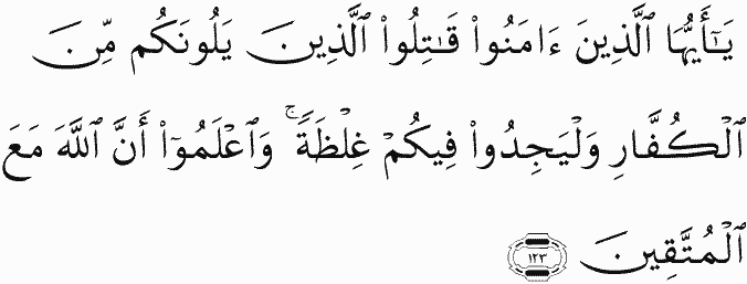O you who have believed, fight those adjacent to you of the disbelievers and let them find in you harshness. And know that Allah is with the righteous.