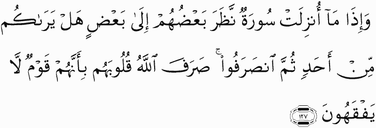 And whenever a surah is revealed, they look at each other, [saying], "Does anyone see you?" and then they dismiss themselves. Allah has dismissed their hearts because they are a people who do not understand.