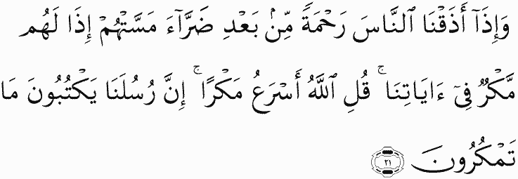 And when We give the people a taste of mercy after adversity has touched them, at once they conspire against Our verses. Say, " Allah is swifter in strategy." Indeed, Our messengers record that which you conspire