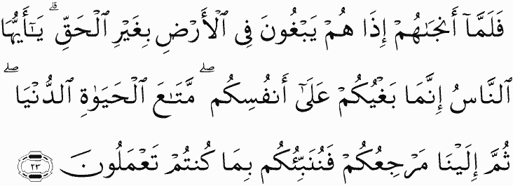 But when He saves them, at once they commit injustice upon the earth without right. O mankind, your injustice is only against yourselves, [being merely] the enjoyment of worldly life. Then to Us is your return, and We will inform you of what you used to do.