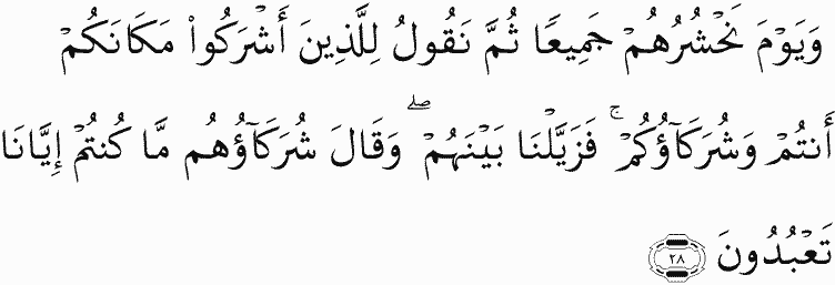 And [mention, O Muhammad], the Day We will gather them all together - then We will say to those who associated others with Allah , "[Remain in] your place, you and your 'partners.' " Then We will separate them, and their "partners" will say, "You did not used to worship us,