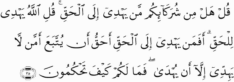 Say, "Are there of your 'partners' any who guides to the truth?" Say, " Allah guides to the truth. So is He who guides to the truth more worthy to be followed or he who guides not unless he is guided? Then what is [wrong] with you - how do you judge?"