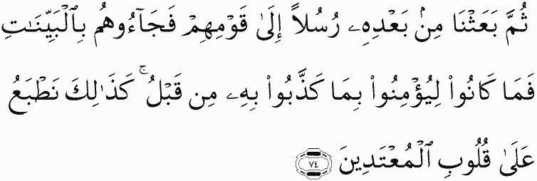 Then We sent after him messengers to their peoples, and they came to them with clear proofs. But they were not to believe in that which they had denied before. Thus We seal over the hearts of the transgressors
