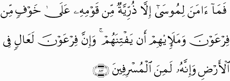 But no one believed Moses, except [some] youths among his people, for fear of Pharaoh and his establishment that they would persecute them. And indeed, Pharaoh was haughty within the land, and indeed, he was of the transgressors