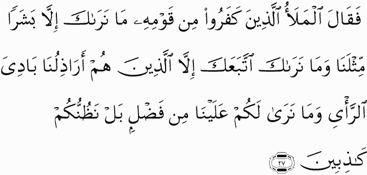 So the eminent among those who disbelieved from his people said, " We do not see you but as a man like ourselves, and we do not see you followed except by those who are the lowest of us [and] at first suggestion. And we do not see in you over us any merit; rather, we think you are liars."
