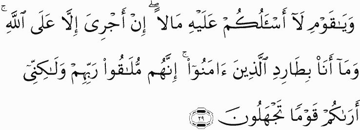 And O my people, I ask not of you for it any wealth. My reward is not but from Allah . And I am not one to drive away those who have believed. Indeed, they will meet their Lord, but I see that you are a people behaving ignorantly.