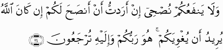 And my advice will not benefit you - although I wished to advise you - If Allah should intend to put you in error. He is your Lord, and to Him you will be returned."