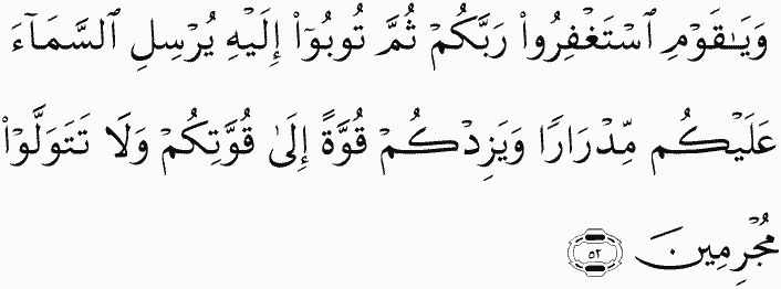 And O my people, ask forgiveness of your Lord and then repent to Him. He will send [rain from] the sky upon you in showers and increase you in strength [added] to your strength. And do not turn away, [being] criminals."