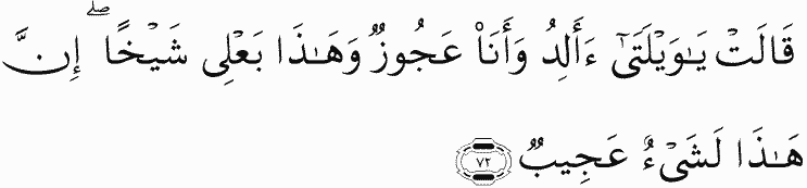 She said, "Woe to me! Shall I give birth while I am an old woman and this, my husband, is an old man? Indeed, this is an amazing thing!"