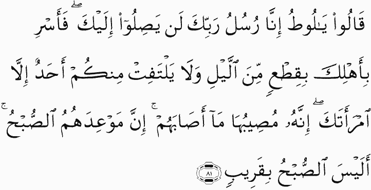 The angels said, "O Lot, indeed we are messengers of your Lord; [therefore], they will never reach you. So set out with your family during a portion of the night and let not any among you look back - except your wife; indeed, she will be struck by that which strikes them. Indeed, their appointment is [for] the morning. Is not the morning near?"