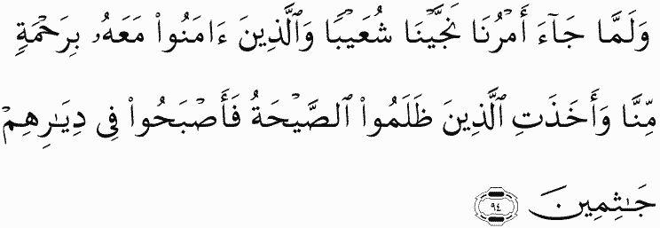 And when Our command came, We saved Shu'ayb and those who believed with him, by mercy from Us. And the shriek seized those who had wronged, and they became within their homes [corpses] fallen prone