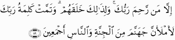 Except whom your Lord has given mercy, and for that He created them. But the word of your Lord is to be fulfilled that, "I will surely fill Hell with jinn and men all together."