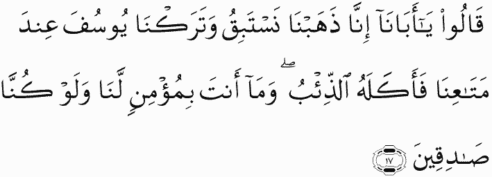 They said, "O our father, indeed we went racing each other and left Joseph with our possessions, and a wolf ate him. But you would not believe us, even if we were truthful."