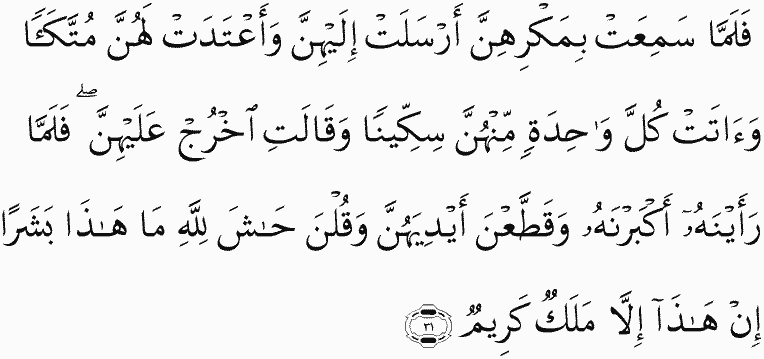 So when she heard of their scheming, she sent for them and prepared for them a banquet and gave each one of them a knife and said [to Joseph], "Come out before them." And when they saw him, they greatly admired him and cut their hands and said, "Perfect is Allah ! This is not a man; this is none but a noble angel."