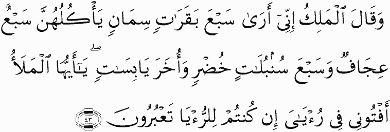 And [subsequently] the king said, "Indeed, I have seen [in a dream] seven fat cows being eaten by seven [that were] lean, and seven green spikes [of grain] and others [that were] dry. O eminent ones, explain to me my vision, if you should interpret visions."