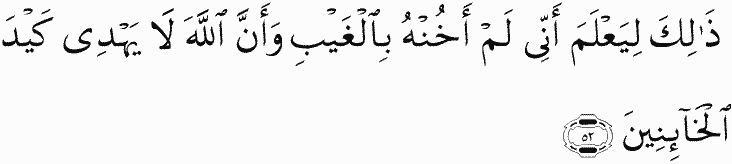 That is so al-'Azeez will know that I did not betray him in [his] absence and that Allah does not guide the plan of betrayers.