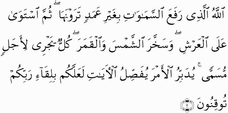 It is Allah who erected the heavens without pillars that you [can] see; then He established Himself above the Throne and made subject the sun and the moon, each running [its course] for a specified term. He arranges [each] matter; He details the signs that you may, of the meeting with your Lord, be certain.