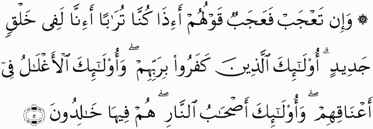 And if you are astonished, [O Muhammad] - then astonishing is their saying, "When we are dust, will we indeed be [brought] into a new creation?" Those are the ones who have disbelieved in their Lord, and those will have shackles upon their necks, and those are the companions of the Fire; they will abide therein eternally.