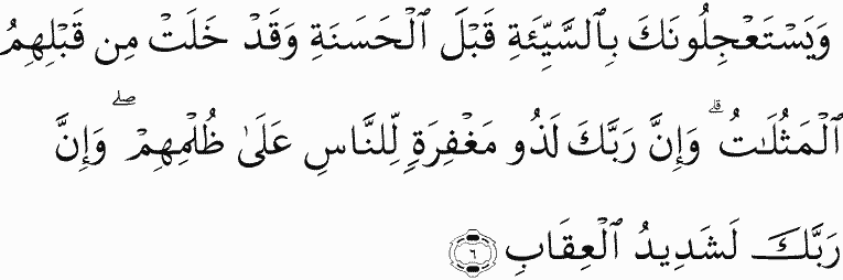 They impatiently urge you to bring about evil before good, while there has already occurred before them similar punishments [to what they demand]. And indeed, your Lord is full of forgiveness for the people despite their wrongdoing, and indeed, your Lord is severe in penalty.