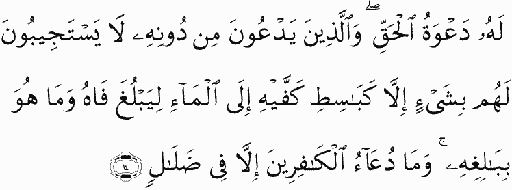 To Him [alone] is the supplication of truth. And those they call upon besides Him do not respond to them with a thing, except as one who stretches his hands toward water [from afar, calling it] to reach his mouth, but it will not reach it [thus]. And the supplication of the disbelievers is not but in error [i.e. futility].