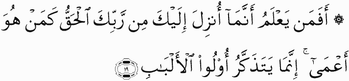 Then is he who knows that what has been revealed to you from your Lord is the truth like one who is blind? They will only be reminded who are people of understanding -