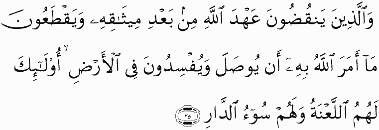 But those who break the covenant of Allah after contracting it and sever that which Allah has ordered to be joined and spread corruption on earth - for them is the curse, and they will have the worst home.