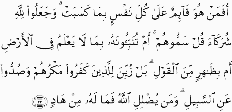 Then is He who is a maintainer of every soul, [knowing] what it has earned, [like any other]? But to Allah they have attributed partners. Say, "Name them. Or do you inform Him of that which He knows not upon the earth or of what is apparent of speech?" Rather, their [own] plan has been made attractive to those who disbelieve, and they have been averted from the way. And whomever Allah leaves astray - there will be for him no guide.