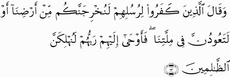 And those who disbelieved said to their messengers, "We will surely drive you out of our land, or you must return to our religion." So their Lord inspired to them, "We will surely destroy the wrongdoers.