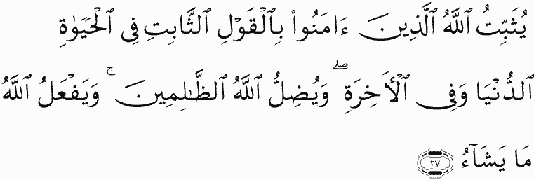 Allah keeps firm those who believe, with the firm word, in worldly life and in the Hereafter. And Allah sends astray the wrongdoers. And Allah does what He wills.