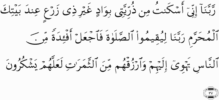 Our Lord, I have settled some of my descendants in an uncultivated valley near Your sacred House, our Lord, that they may establish prayer. So make hearts among the people incline toward them and provide for them from the fruits that they might be grateful.