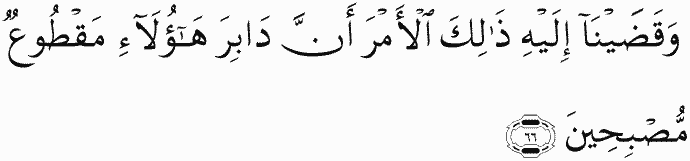 And We conveyed to him [the decree] of that matter: that those [sinners] would be eliminated by early morning.