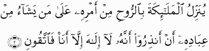 He sends down the angels, with the inspiration of His command, upon whom He wills of His servants, [telling them], "Warn that there is no deity except Me; so fear Me."