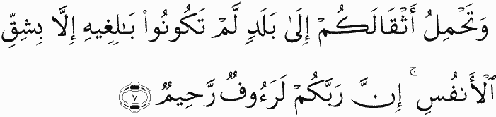 And they carry your loads to a land you could not have reached except with difficulty to yourselves. Indeed, your Lord is Kind and Merciful.