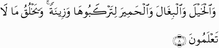 And [He created] the horses, mules and donkeys for you to ride and [as] adornment. And He creates that which you do not know.