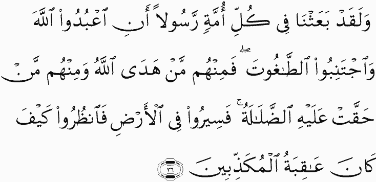 And We certainly sent into every nation a messenger, [saying], "Worship Allah and avoid Taghut." And among them were those whom Allah guided, and among them were those upon whom error was [deservedly] decreed. So proceed through the earth and observe how was the end of the deniers.
