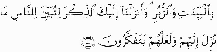 [We sent them] with clear proofs and written ordinances. And We revealed to you the message that you may make clear to the people what was sent down to them and that they might give thought.