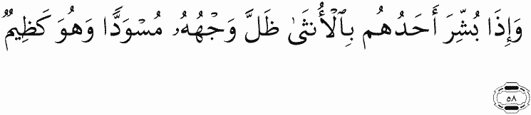And when one of them is informed of [the birth of] a female, his face becomes dark, and he suppresses grief.