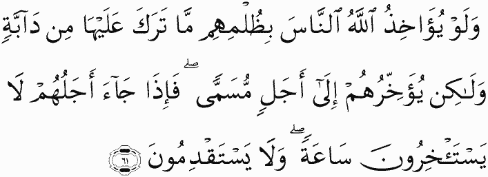 And if Allah were to impose blame on the people for their wrongdoing, He would not have left upon the earth any creature, but He defers them for a specified term. And when their term has come, they will not remain behind an hour, nor will they precede [it].