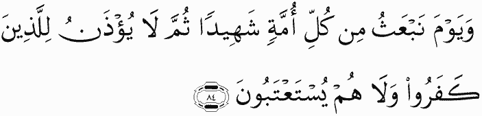 And [mention] the Day when We will resurrect from every nation a witness. Then it will not be permitted to the disbelievers [to apologize or make excuses], nor will they be asked to appease [ Allah ].