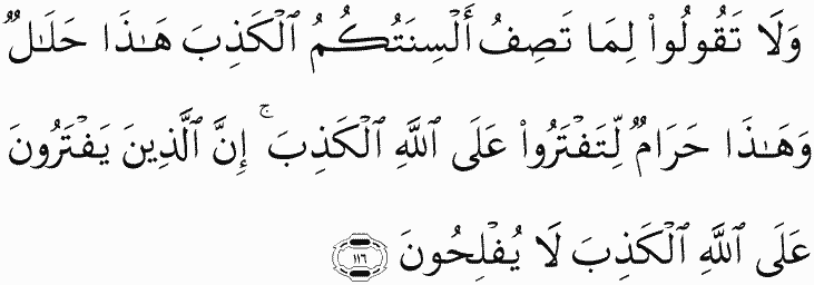 And do not say about what your tongues assert of untruth, "This is lawful and this is unlawful," to invent falsehood about Allah . Indeed, those who invent falsehood about Allah will not succeed.