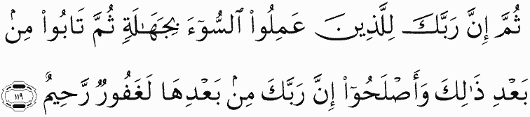 Then, indeed your Lord, to those who have done wrong out of ignorance and then repent after that and correct themselves - indeed, your Lord, thereafter, is Forgiving and Merciful.
