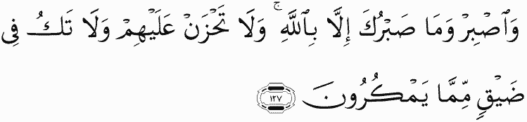 And be patient, [O Muhammad], and your patience is not but through Allah . And do not grieve over them and do not be in distress over what they conspire.